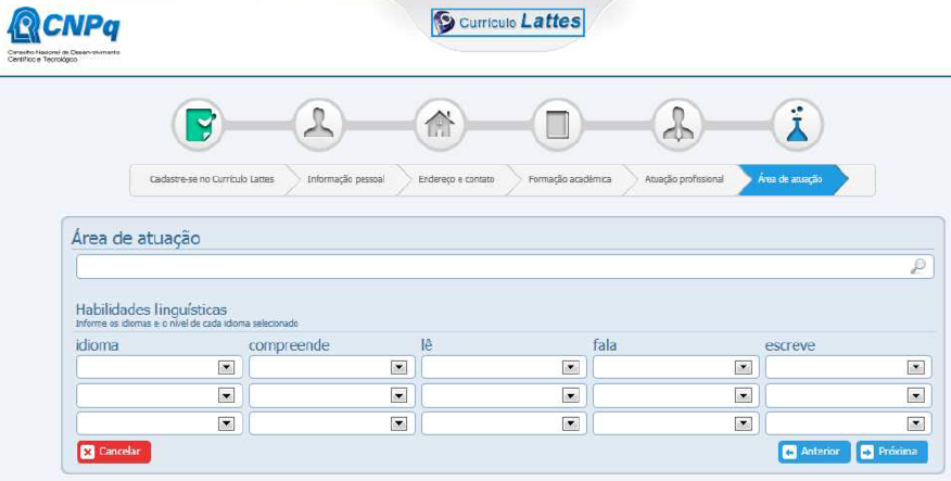 A sexta e última tela do sistema de criação do Currículo Lattes exige dados sobre sua área de atuação e sua proficiência linguística. Se você lê bem, mas não fala tão bem assim o inglês, ou arranha no espanhol, aqui é o campo onde deve ser descrita a sua competência linguística. É possível identificar sua capacidade de “se virar” nos mais diversos idiomas em relação a compreensão, leitura, fala e escrita.